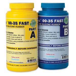 Certified skin-safe, both products are mixed 1A:1B by weight or volume and cure at room temperature with a minimum of shrinkage. The cured rubber is very soft, very strong, and very stretchy, stretching many times its original size without tearing, and rebounding to its original form without distortion. Both 00-30 and 00-35 can be color-pigmented with Smooth-On Silc Pig silicone color pigments.