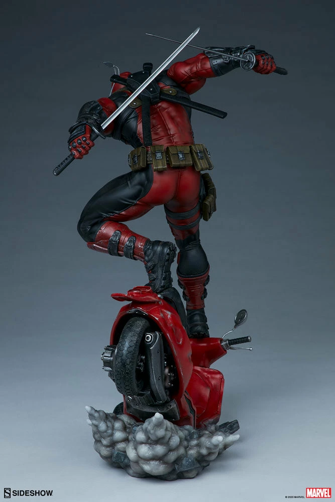 Coming in hot! The Deadpool Premium Formatβ’ Figure measures 20.5β tall as Wade Wilson makes his epic entrance on a crashing red scooter, kicking up a cloud of smoke behind him. Deadpool comes brandishing his signature katanas, but also includes a pair of swap-out hands with fistfuls-o-utensils, just in case the Merc with a Mouth needs to knife, fork with, or even spoon the baddies.
