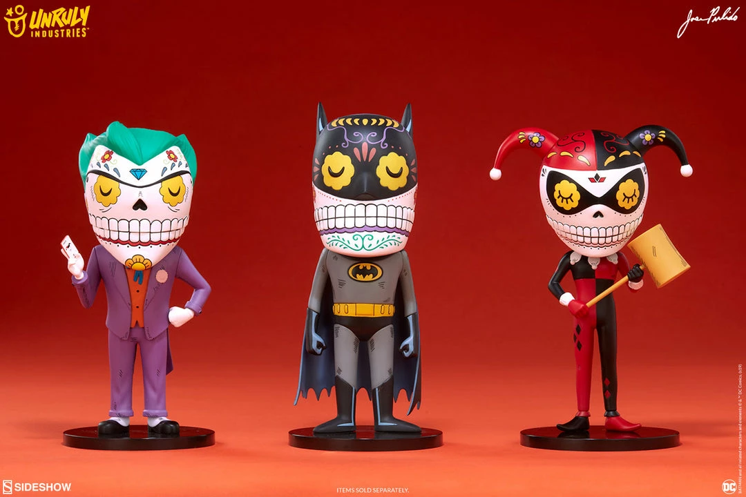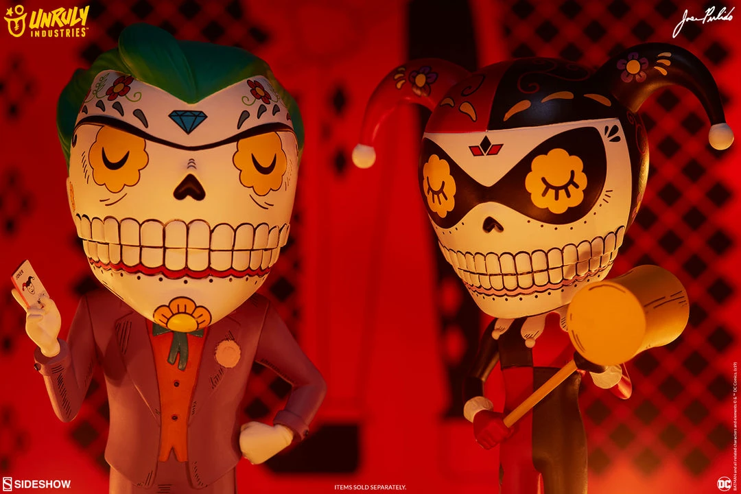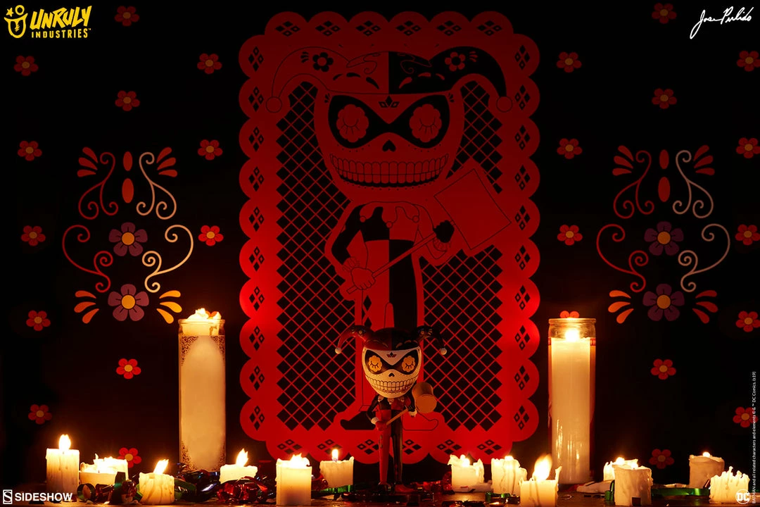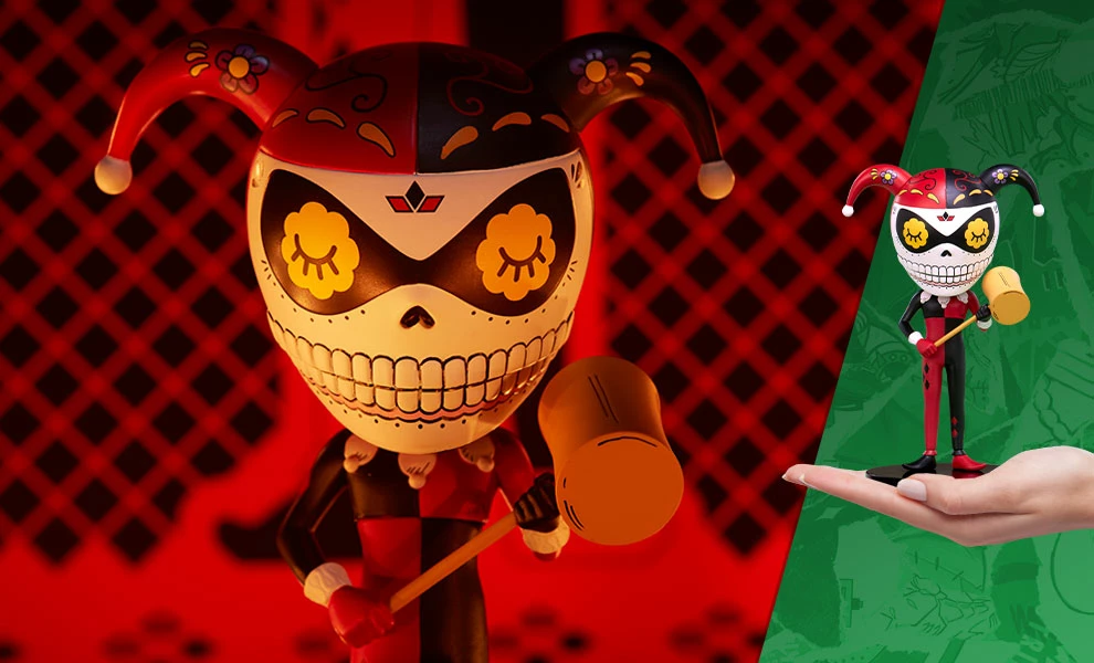 Jose Pulido’s Harley Quinn Calavera limited edition designer collectible toy captures Gotham’s iconic Maid of Mischief with a colorful new lease on afterlife!