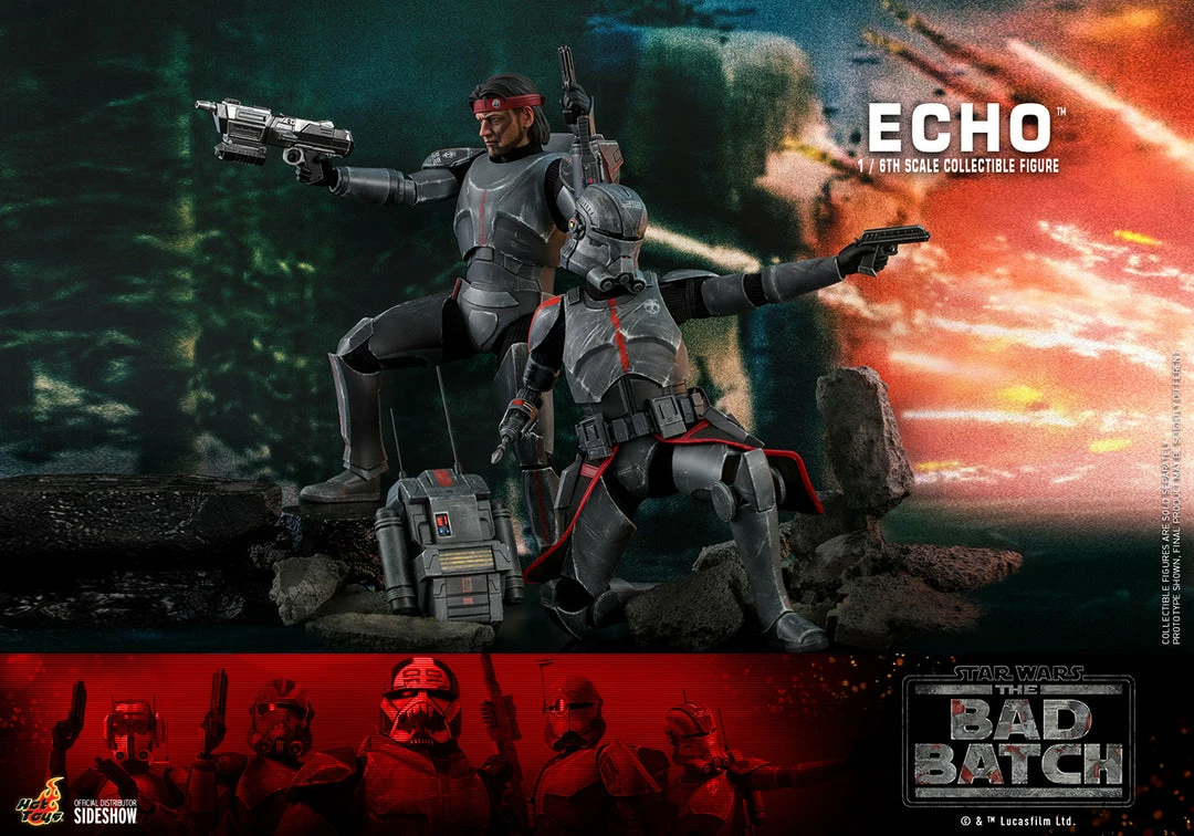 Former ARC Trooper Echo joined the Bad Batch towards the end of the Clone Wars after his rescue from the Techno Union. Echoโs knowledge of proper military tactics and strategy provides valuable insight, while his socket-arm and cybernetic implants give him the unique ability to interact with computer systems.