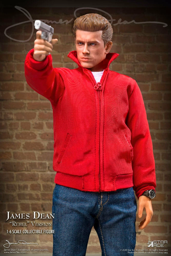 Star Ace brings James Dean to life as a fully realized sixth scale figure dressed as a teen “Rebel” and featuring a detailed and accurate likeness and dressed in his iconic red jacket, white T-shirt, black boots and jeans. Accessories include sunglasses, a comb, cigarettes and a camera.
