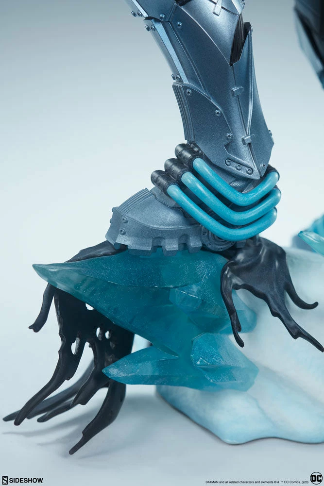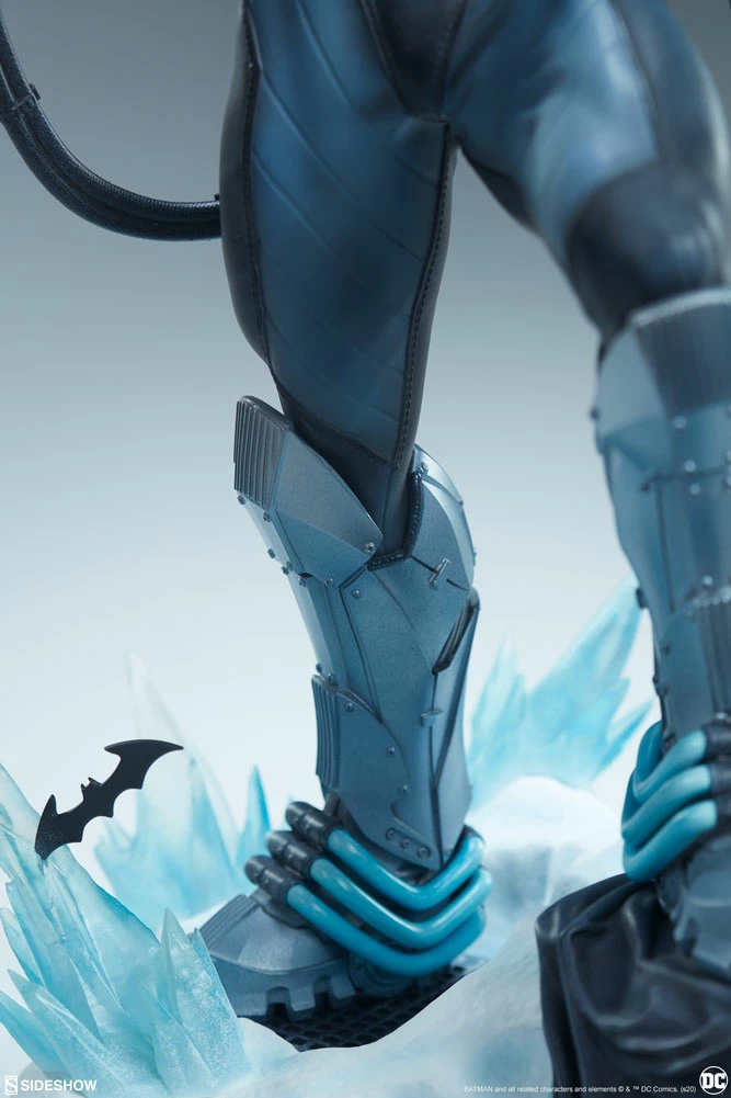 The Mr. Freeze Premium Format™ Figure measures 24” tall on top of a frostbitten laboratory base. As Batman’s below-zero foe, Victor Fries has his cryogenic gun prepared to give the Dark Knight a cold reception. Jagged blue ice crystals protrude upwards from the snowy scene, which features the tatters of a black cape and a batarang below Freeze’s boots.