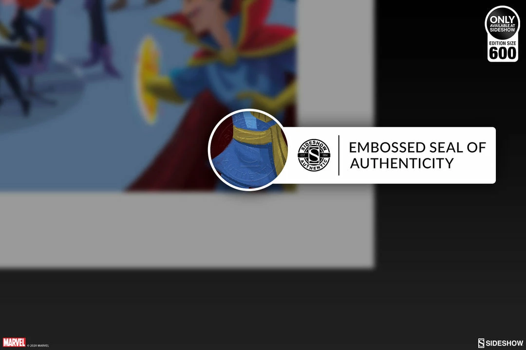 Each Party at Avengers Tower Fine Art Print features an authorized, automated artist signature and an embossed Seal of Authenticity as a part of the limited edition of 600 pieces. This colorful and character-filled illustration is a must-have for fans of any Marvel superhero!