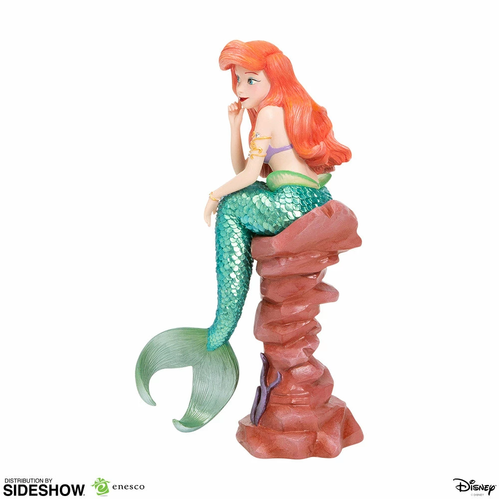 The most iconic mermaid in the world, free-spirited and curious Ariel from Disneyβs The Little Mermaid poses on an undersea rock formation evoking a stylish contemporary glamour in this sophisticated figurine from Disney Couture de Force. The modern haute couture costuming features duo-chrome color shift blue green scales on Arielβs tail, four faceted faux diamonds on her golden arm bracelets and pendant and an iridescent sea foam green finish on her fin. Other exquisite details include translucent tinted green elements around her waist and textured red hair sculpted so as to appear floating underwater. Princess Arielβs timeless and magical story from the undersea to the human world empowers us to seek our dreams and dare to be adventurous in our everyday lives.