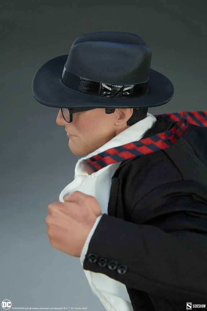 The mixed-media Superman: Call to Action Premium Format™ Figure features a polyresin body and sculpted blue super suit revealed beneath a carefully tailored fabric suit, which consists of a black jacket, white dress shirt, striped tie with internal wiring, and black pants. The symbol of the House of El on his chest serves as a beacon of hope to those in need of help as Kal-El fights for truth, justice, and the American way. The Superman: Call to Action Premium Format™ Figure also includes both a Clark Kent portrait with his hat and glasses as well as a Superman portrait with his iconic kiss curl and a determined look on his face.