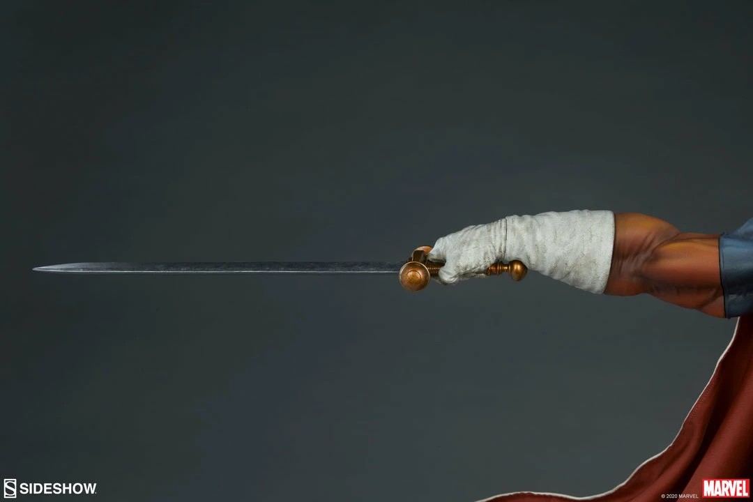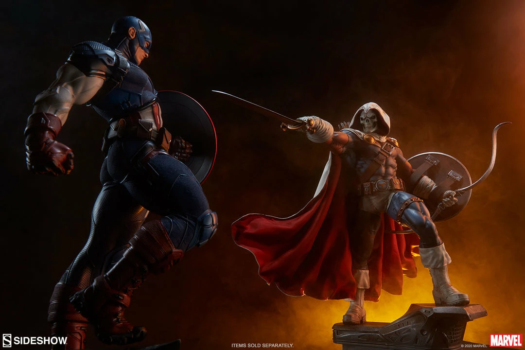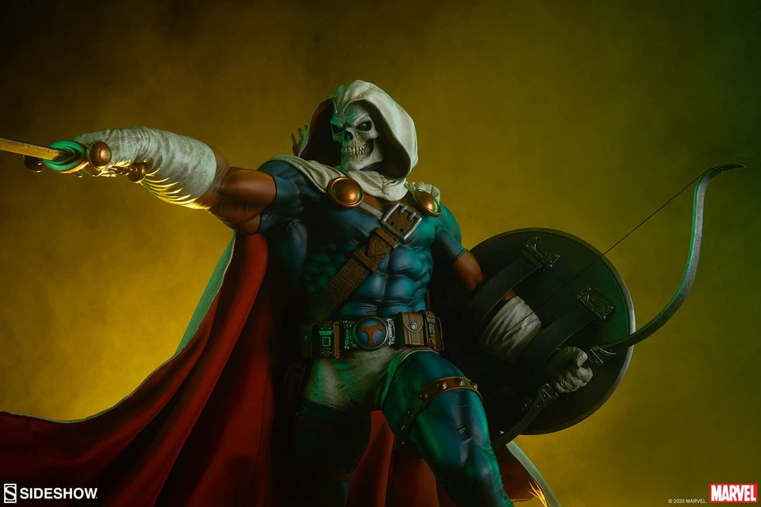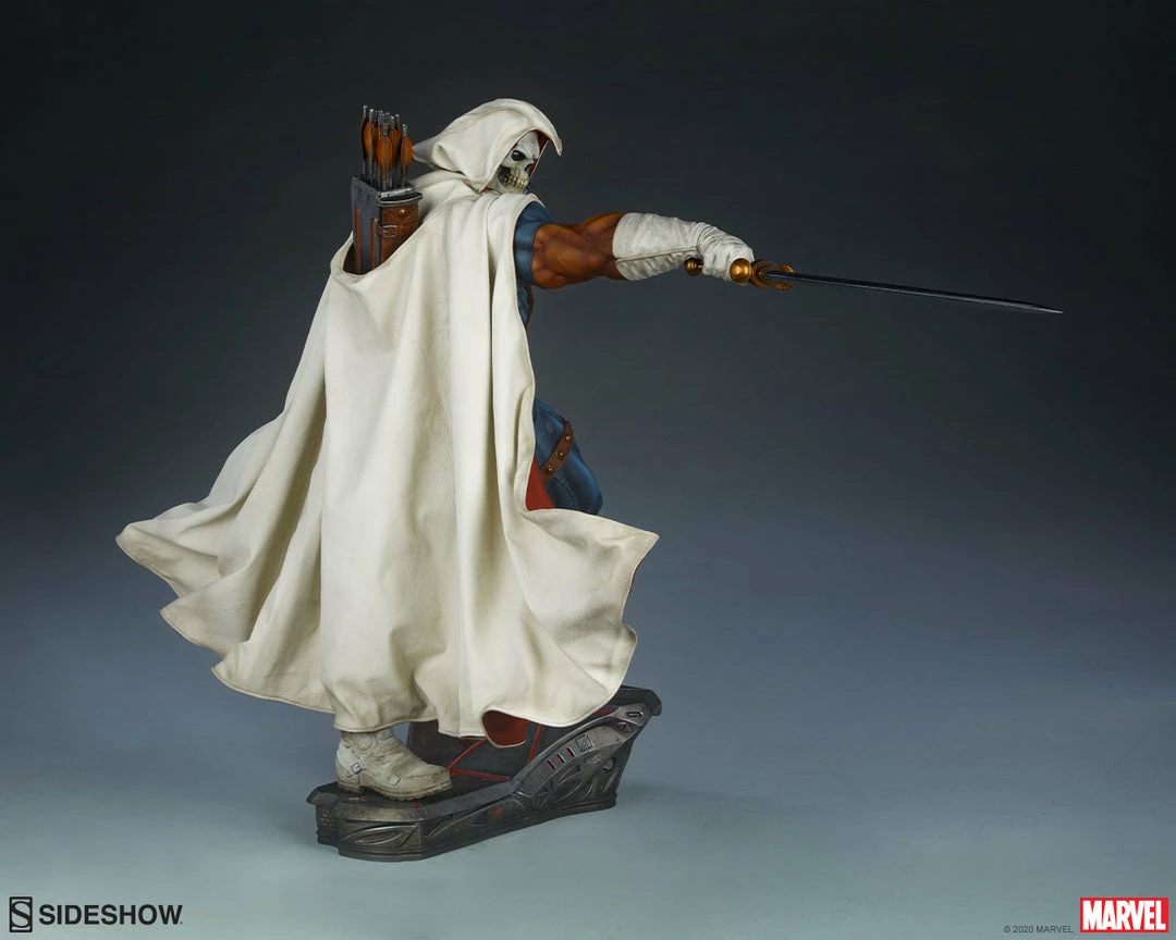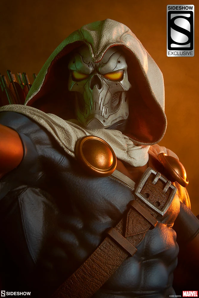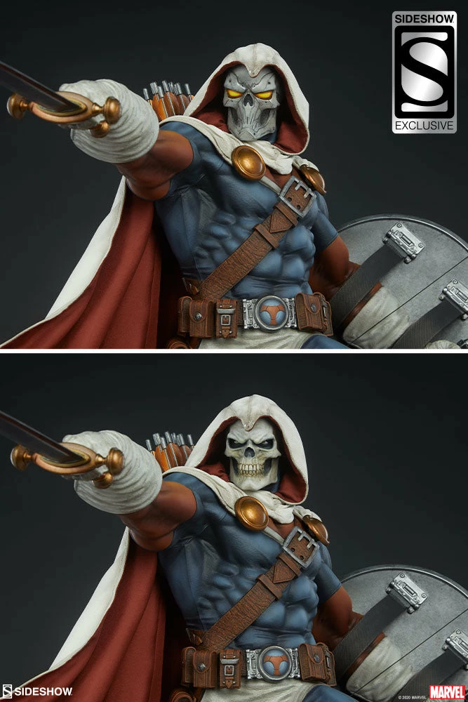 The polyresin Taskmaster Premium Format™ Figure features a mixed media costume with faithful callbacks to his earliest appearance as well as modernized elements. Taskmaster wears a wired, posable fabric cape and hood with a white textured exterior, red inner lining, and weathering details. The rest of his blue, orange, and white costume is sculpted and includes his bodysuit, belts, gloves, and boots to complete his striking look. Taskmaster’s shield and belt buckle are emblazoned with his signature ‘T’ shaped logo, and his menacing skull mask portrait gives this master combatant an ominous appearance.