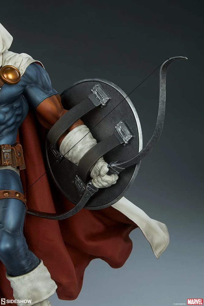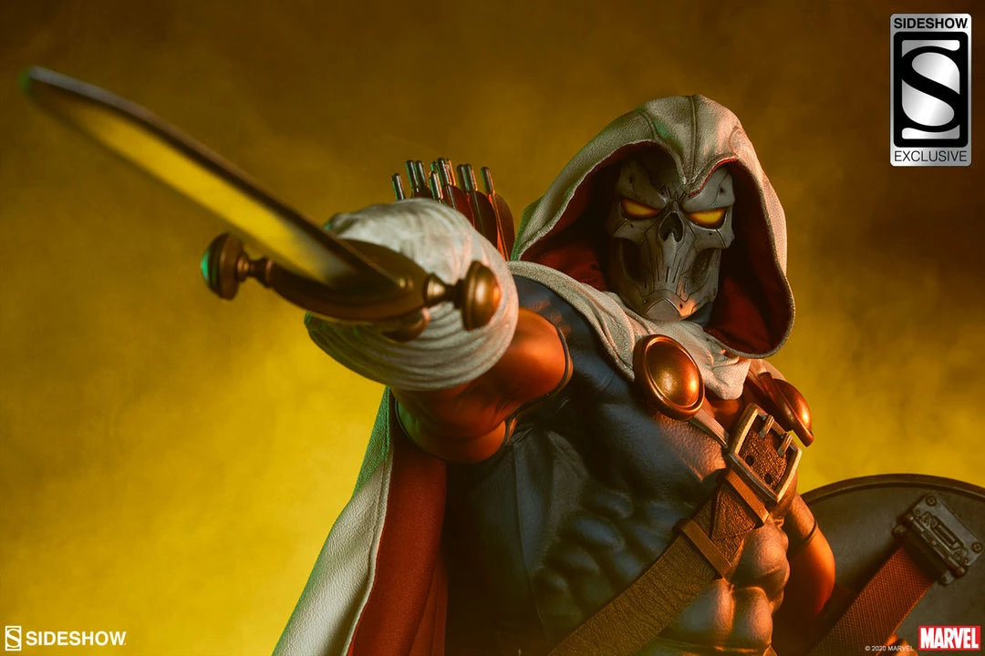 The Taskmaster Premium Format™ Figure measures 21.5” tall and 25” wide, poised on top of a training facility base as the skilled tactician Tony Masters brandishes his sword assertively at his foes. Armed with his traditional Avengers-fighting arsenal, including the sword, a shield, and a bow and quiver, Taskmaster stands confident that he has already won the battle before it even begins.