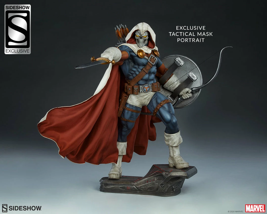 The Exclusive Edition of the Taskmaster Premium Format™ Figure includes an alternate tactical mask portrait, which swaps this supervillain’s traditional skull face for a more modern armored look.