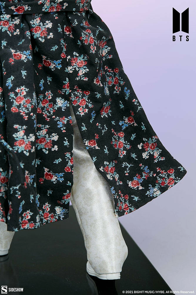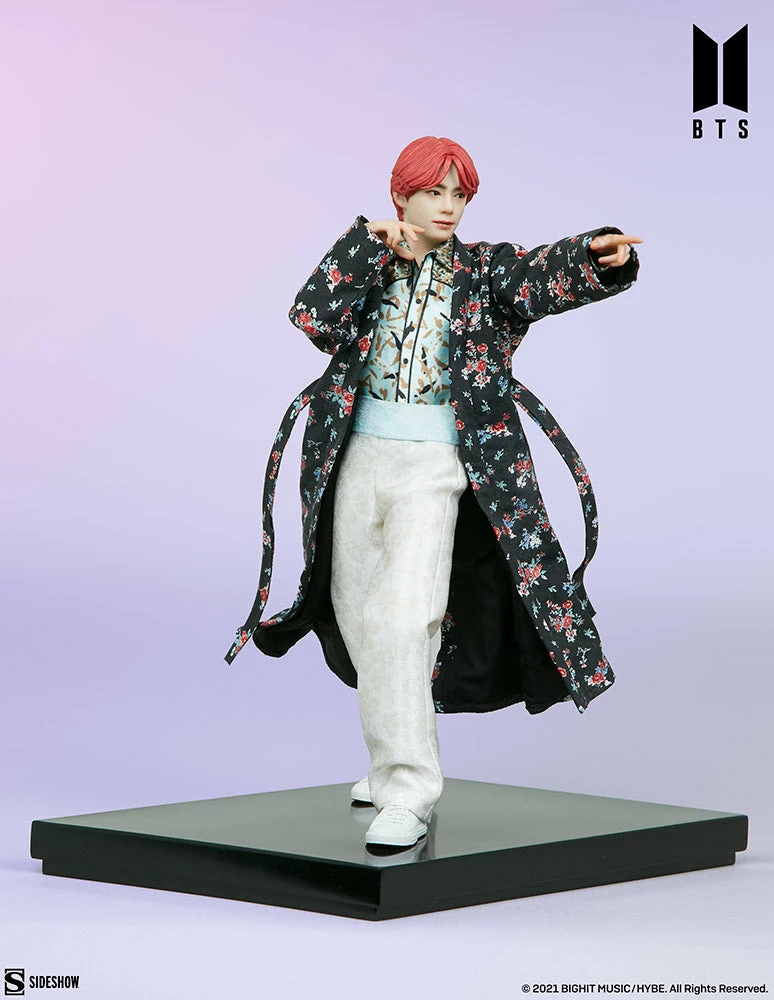 The V Deluxe Statue measures 9.1” tall and 8.4” wide and features an intricate mixed media costume application. The carefully tailored outfit includes wire for posing the robe fabric to capture the dynamic movement of V’s stage presence. Complete with sculpted details like an earring and white shoes, the energetic figure stands on a black stage base to match the other members of the collection.