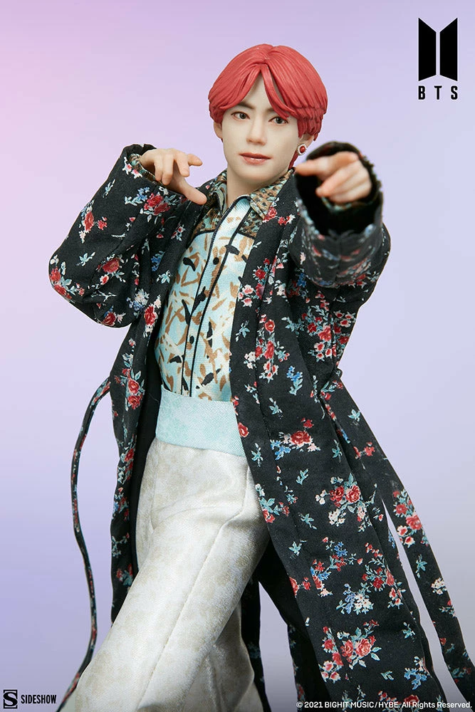 In this colorful representation, V points, one hand floating near his cherry red hair and the other extended out to the crowd. He wears a powder blue shirt and white trousers with his black floral robe sweeping out as he steps to his next dance move.